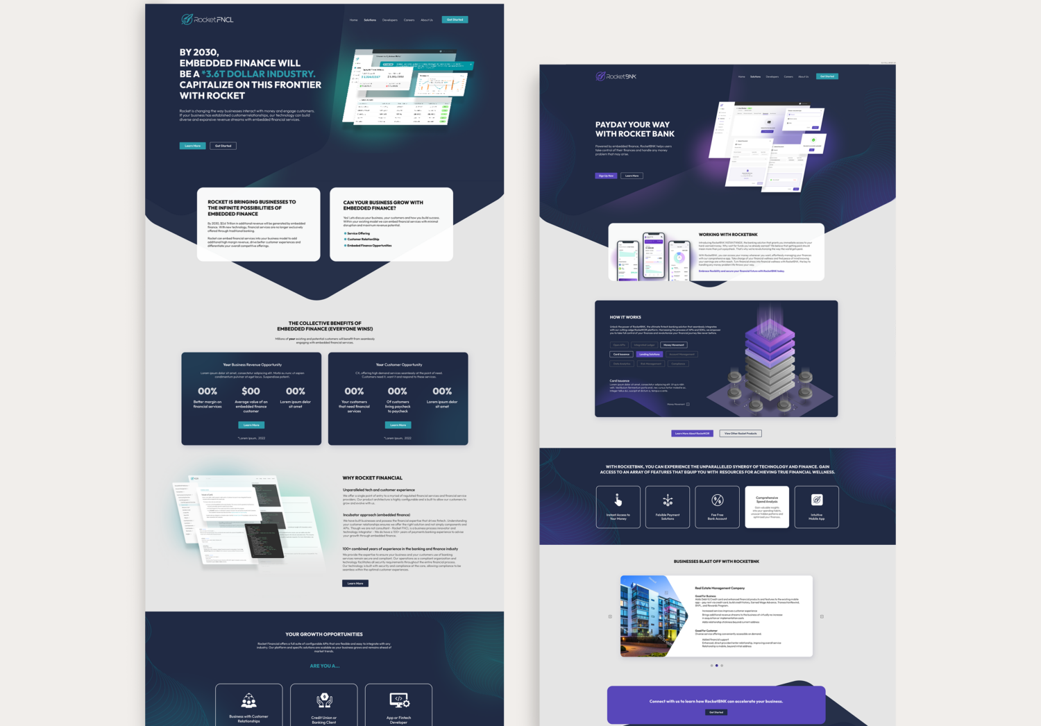 Rocket Financial operated within a unique market, offering multiple distinct products (solutions) under one umbrella. The challenge was clearly differentiating each solution while maintaining a cohesive brand presence. Each offering needed to feel unique without fragmenting the overall experience. An additional requirement was a dedicated developer-focused section with its own functionality. While the company name leaned toward literal “rocket” visuals, we needed a concept that felt refined, innovative, and aligned with the brand’s future-facing vision.